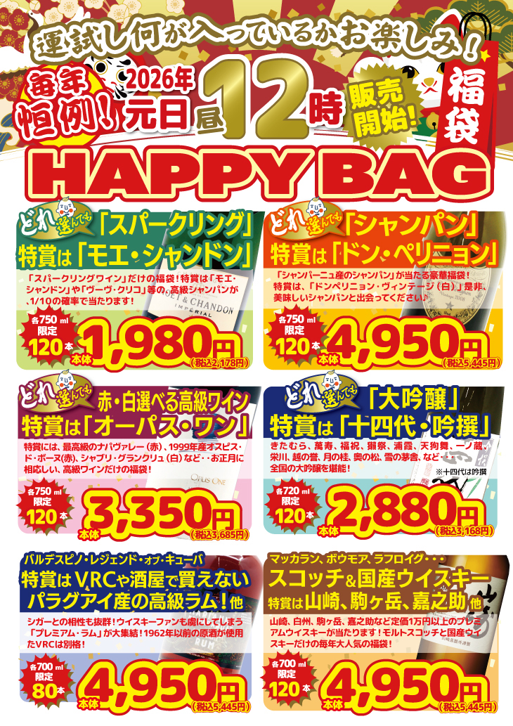 リカープラザ大越酒店 2026年新春告知その① 『恒例!ハッピーバック』 元旦昼12:00より発売開始!! 投稿日 2025年12月30日 著者 liquor-plaza-k カテゴリー イベント告知 カテゴリー お知らせ 2026年新春告知その①毎年恒例の『ハッピーバック』の販売を2026年もやります!元旦のお昼12:00からの販売となります。売切れ次第終了となりますので、お早めにお買い求めくださいませ!