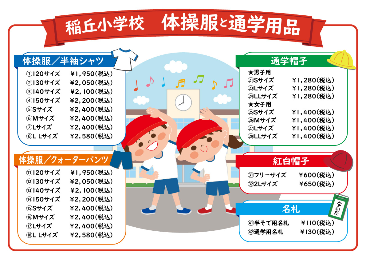 稲丘小学校の学生の皆さまへ 体操服と通学用品の販売をはじめました。 投稿日 2025年12月3日 更新日 2025年12月20日 著者 liquor-plaza-k カテゴリー お知らせ リカープラザ大越商店にて、稲丘小学校の体操服および通学用品の販売を開始しました。お取り扱い商品は以下の通りです。 〈取扱商品〉・体操服(半袖シャツ/男女用)・体操服(クォーターパンツ/男女用)・通学帽子(男女用)・紅白帽子(男女用)・名札(半袖用・通学用) 〈営業時間〉◎月~金 10:00~21:00◎土・祝・特定日曜 10:00~20:00◎定休日:日曜 皆さまのご来店をお待ちしております。